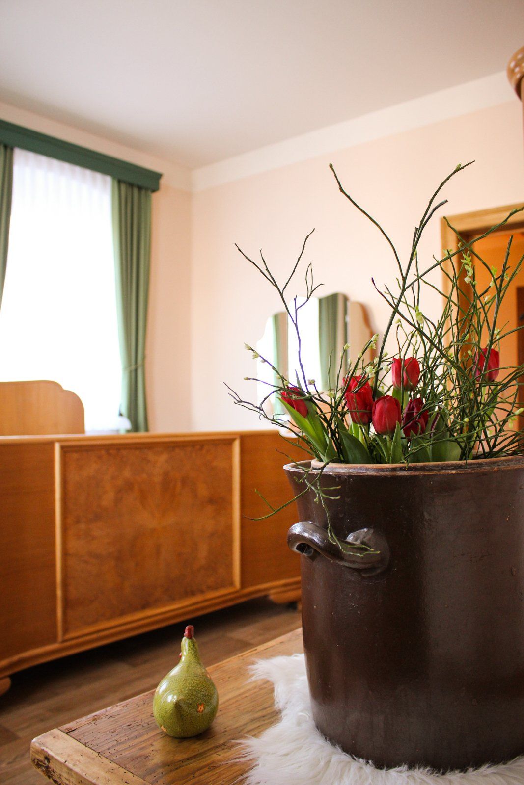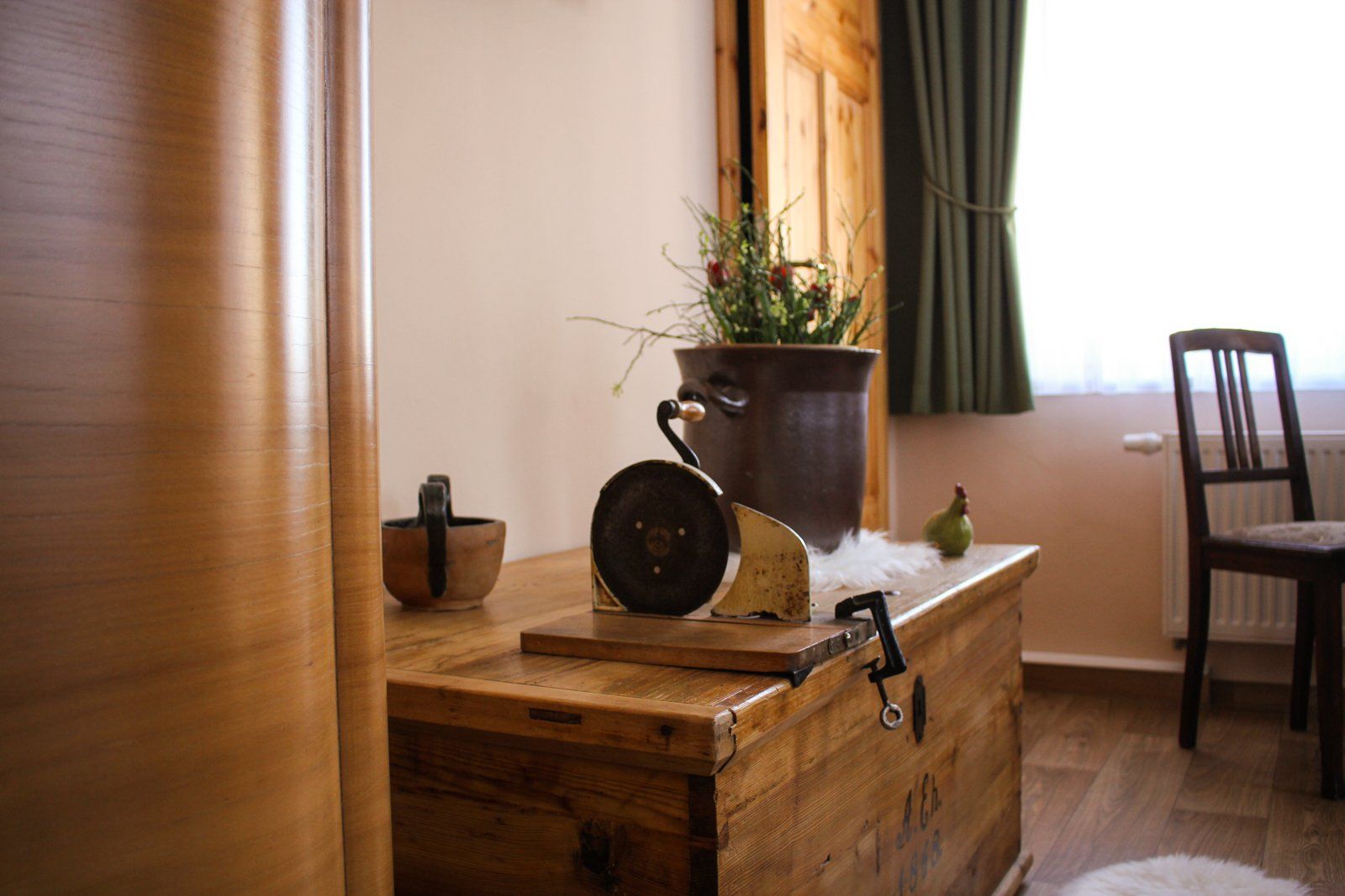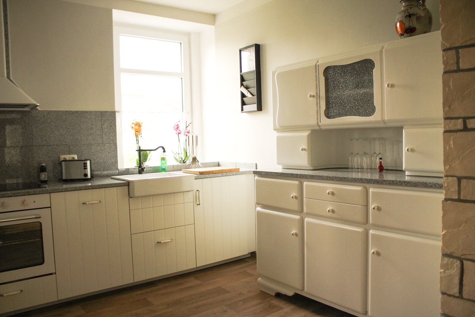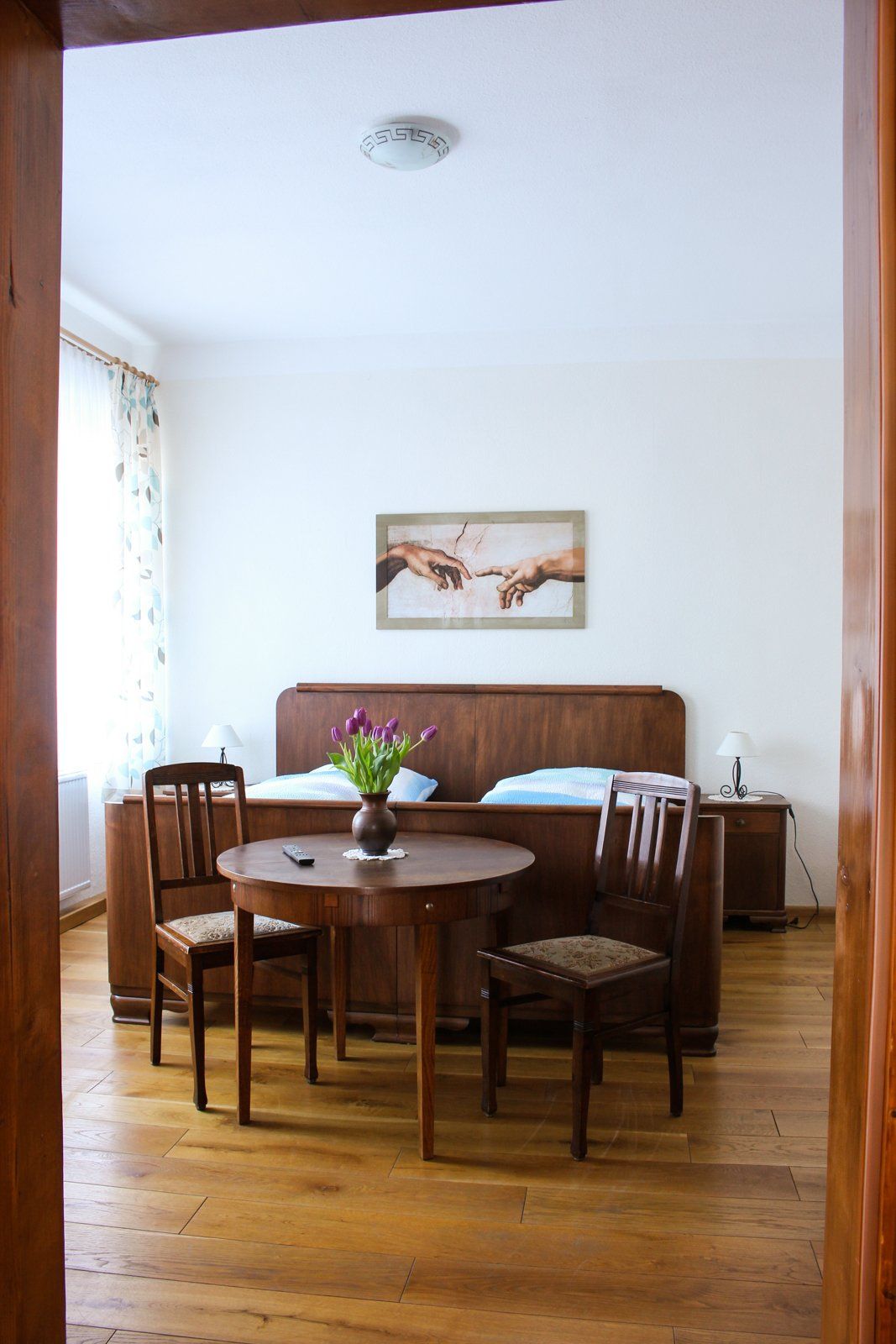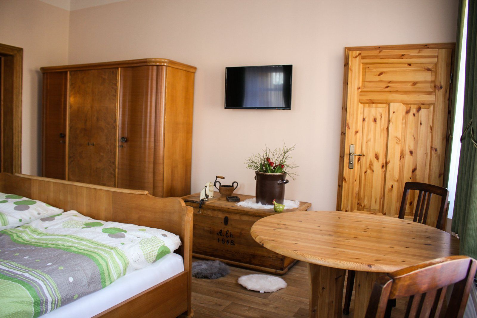 Es gibt bei uns eine Ferienwohnung bestehend aus einem Aufenthaltsraum mit integrierter Küche und einem Doppelzimmer
